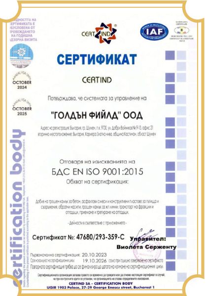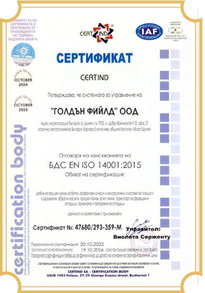 Приоритет на ръководството на „ГОЛДЪН ФИЙЛД” ООД е непрекъснато повишаване качеството на работа чрез политика на удовлетворяване изискванията на клиенти и партньори за качество на продуктите, коректно обслужване, грижа за околната среда, здравето и безопасността при работа.